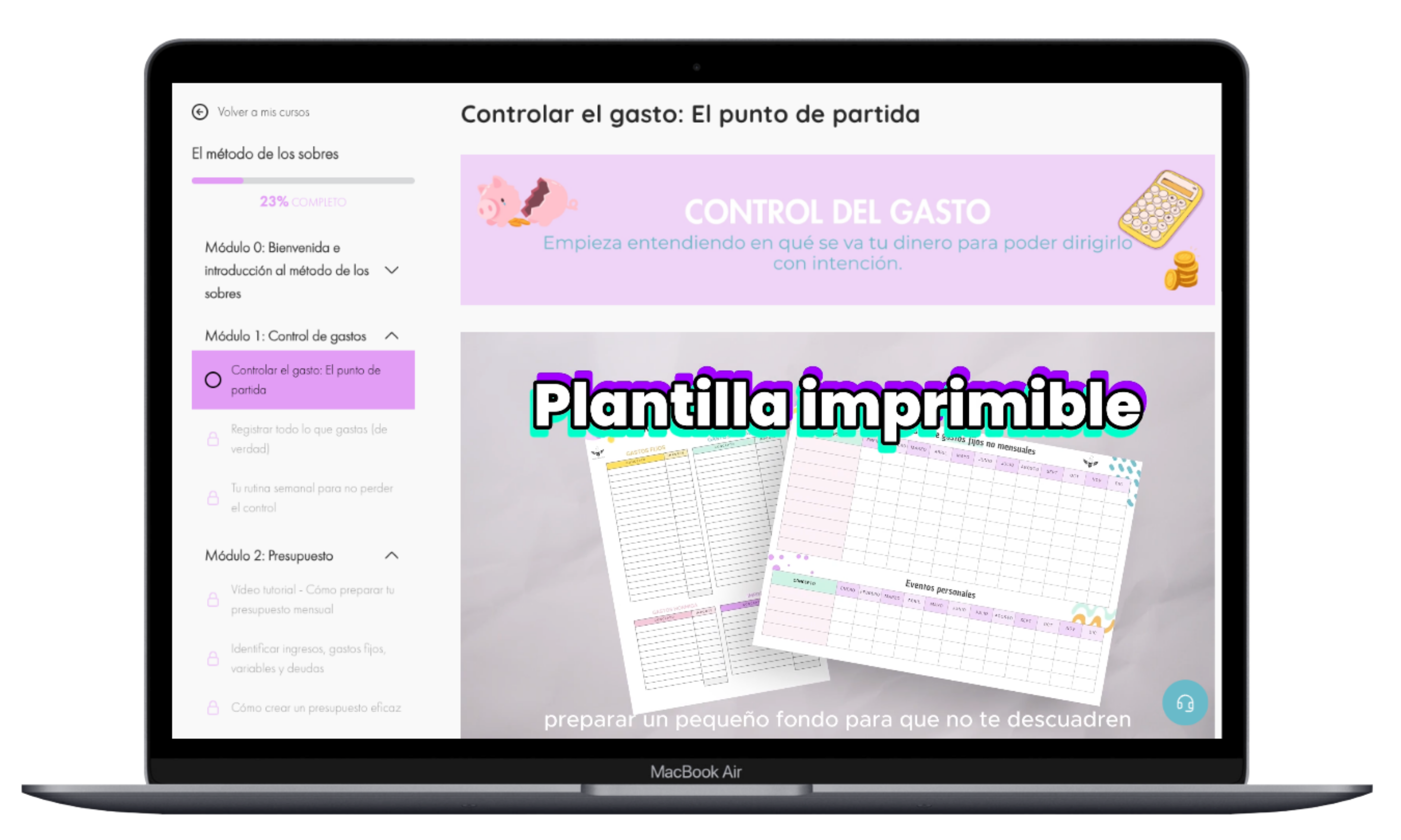 Con este curso, por fin vas a entender qué ocurre con tu dinero cada mes y cómo puedes tomar decisiones con más calma y claridad. Todo explicado paso a paso, con ejemplos reales y ejercicios pensados para ayudarte a avanzar sin agobios. Desde la primera lección sentirás que, por fin, tienes un sistema que te acompaña… y que funciona.