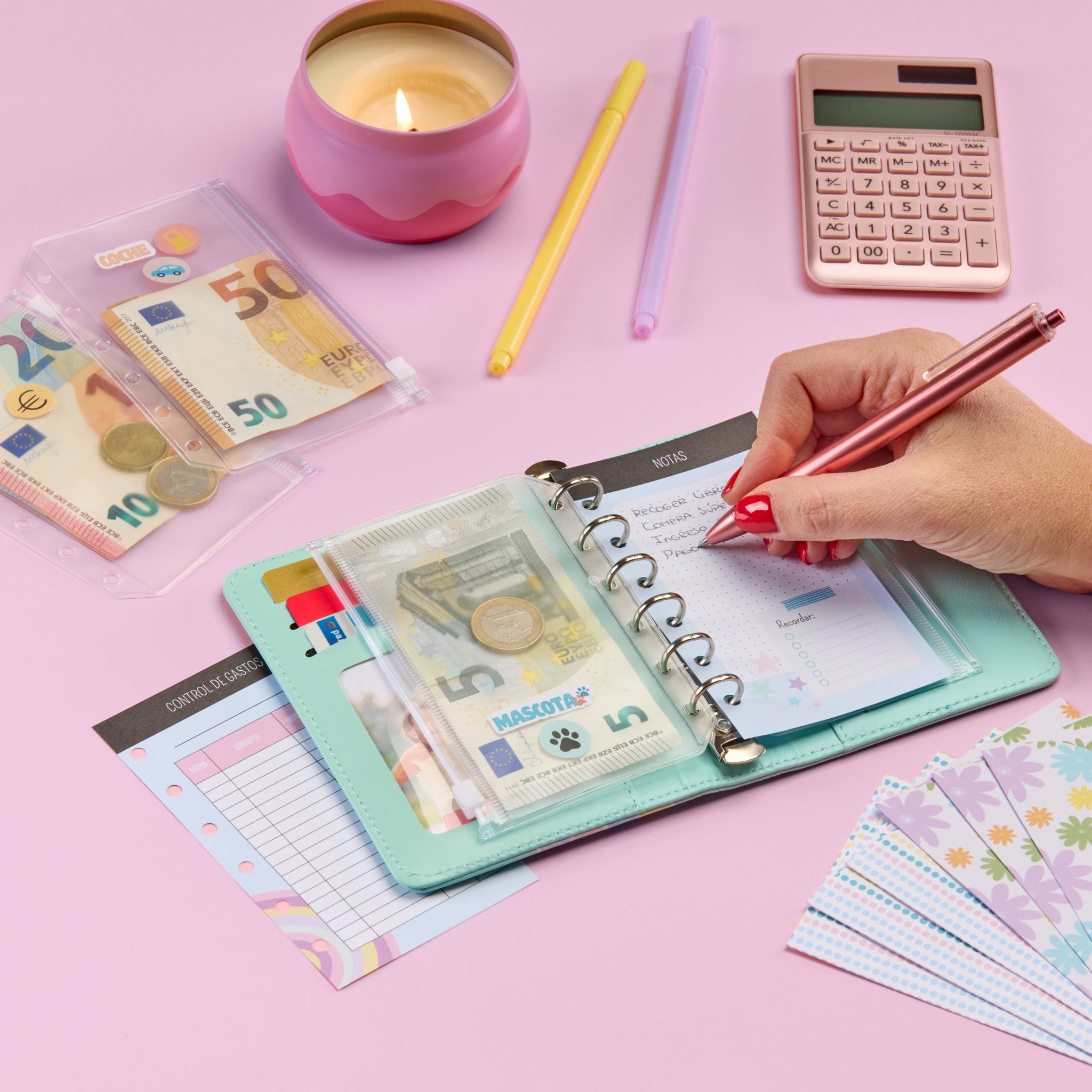 Incluye sobres con cremallera y sobres opacos para que guardes efectivo, notas o pequeños gastos por categoría. Sin distracciones, sin peso extra. Solo lo que necesitas para tener claridad en tu día a día y mantenerte en tu camino de ahorro.